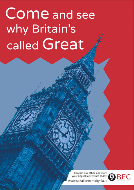 This project's aim was to create a logo, logo type, posters, itinerary and other promotional material for a students exchange program called British Education & Culture (BEC). I had a client who is a director, Albina Sakaliene, of private school based in Lithuania’s capital city Vilnius. The school is called ‘Pamatyk ir Pasimokyk’ and the program belongs to it. My client briefed me with this project: said what travel logos she likes and that for a logotype she would like to see a San Serif font (only because majority of other logos Sakaliene saw were San Serif). She said that program is focusing on students, parents and teachers, which made me realise that target audience is very wide but at the same time it is very specific target group, so, it had to be very trendy, eye catchy, professional and more a like look timeless.